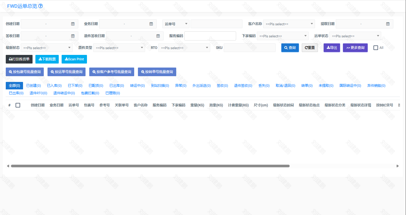 创建/导入运单、标签打印(符合FBA贴标规范)、FWD DTO运单总览(跨境物流可视化)、数据导出(支持清关文件生成)、包裹拦截(避免错发漏发)、退款(自动触发逆向物流)。